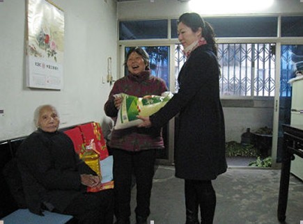 圖:孤寡老人接過(guò)我們的慰問(wèn)品,開懷笑顏