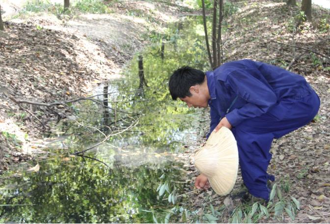 10:50,在81#標(biāo)志樁附近的小樹(shù)林里,溝里的水有些發(fā)黑,王師傅仔細(xì)查找根源,確定是旁邊的染料廢桶堆積場(chǎng)里流出來(lái)的廢水。