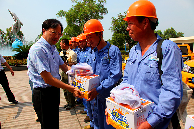7月12日上午,縣委書記何加順、副縣長周樹森等縣委、縣政府領導來到供水公司慰問在高溫下作業的供水一線職工,親手把防暑降溫慰問品送到他們手上,并再三叮囑有關人員落實好夏季高溫時段的防暑降溫措施,確保一線職工身體健康。集團董事長倪阿泉、總經理單寶子等領導陪同慰問。