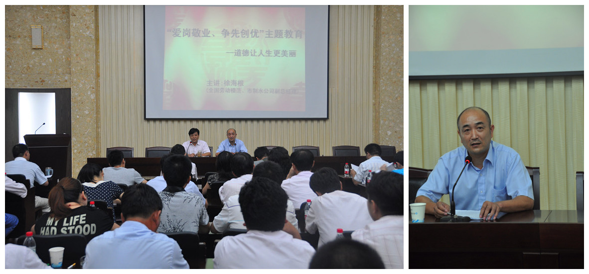 811日下午,公司邀請全國勞動模范、紹興市制水公司副總經理徐海根為公司班組長以上管理干部作題為《道德讓人生更美麗》的宣講教育,共80余人聆聽了模范的精彩宣講。會上,徐海根結合自身工作實際,用樸實的語言從職業道德、責任心、愛崗敬業等方面講述親身經歷的感人故事,感人至深,催人奮進。與會的每個人在這里接受了一次心靈的洗禮,取得較好的效果。